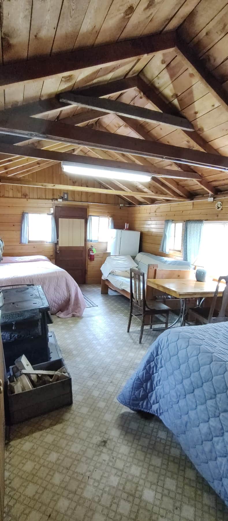 Cabin 8 is a cozy rustic cabin that features a wood-burning stove.